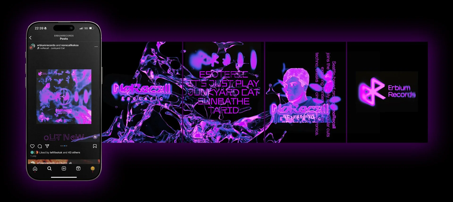 A mix of different assets created for each release we do - this could be in the form of an ‘OUT NOW’ post to track premeires or any sort of content to promote the release. featured on other media outlets, artwork for events featuring the Erbium brand