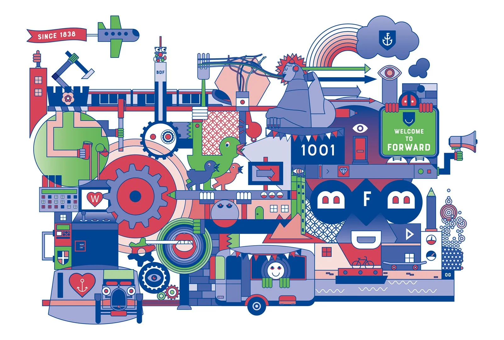 I was invited to create a piece for the Forward Thinking exhibition, curated by the Birmingham Design Festival. Inspired by the theme ‘Forward’ — the motto of the City of Birmingham — my work celebrates the city’s spirit of progress and innovation. It weaves together visual cues from Birmingham’s iconic landmarks and rich history, referencing its role in the Industrial Revolution, as well as local favourites such as Cadbury’s, Bird’s Custard, J.R.R. Tolkien, and the beloved TV character Brum.
