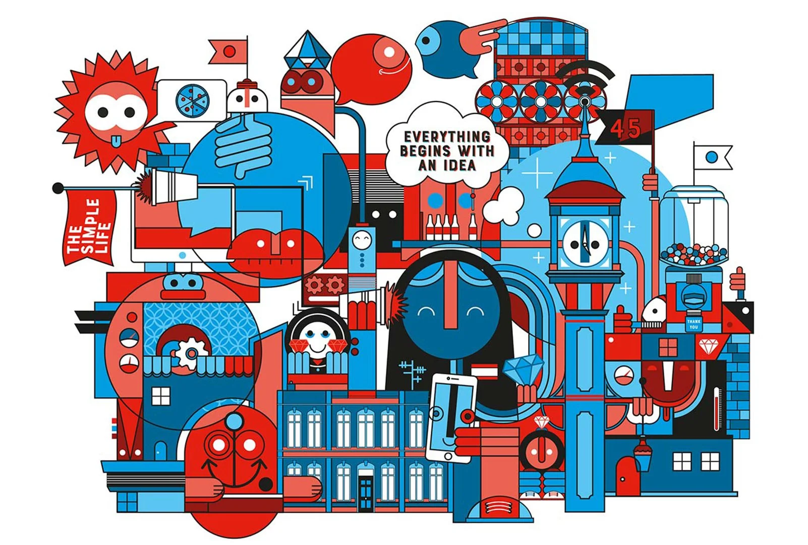 While working at LIFE Agency, I created this mural to be showcased in their Birmingham offices. Centered around the theme “Everything Begins with an Idea,” the design takes a playful, abstract approach to visualizing creativity. It incorporates references to the building itself — located in the historic Jewellery Quarter — and captures the agency’s inventive spirit, almost like an “ideas factory.” The piece celebrates the imagination, energy, and originality that define LIFE and the work they produce for their clients.