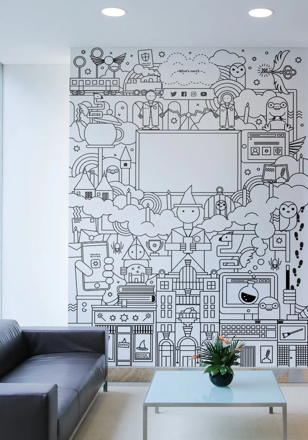 This was my first freelance project after moving to London — designing an office mural for Wizarding World, a collaboration between Warner Bros. and Pottermore. The brief called for a design filled with Easter eggs referencing Wizarding World products, such as the official app, as well as iconic elements from the Harry Potter films — including Diagon Alley, Quidditch, Hedwig, and other beloved details from the series.